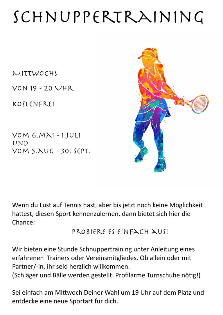- ab 6.5. immer mittwochs ab 19Uhr Schnuppertraining für alle Tennisinteressierten (Pause in den Sommerferien)