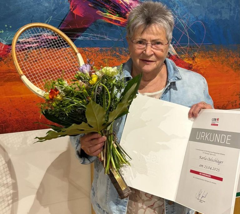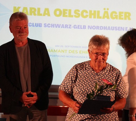 Nachdem Karla Oelschläger bereits im März die Ehrennadel des Landessportbunds Thüringen verliehen bekam, ehrte sie nun der Kreissportbund Nordhausen in seiner Gala 'Diamanten des Sports' für ihre langjährige und unermüdliche Arbeit als Schatzmeisterin des TC Nordhausen.